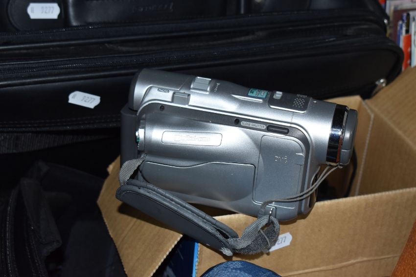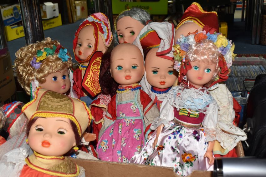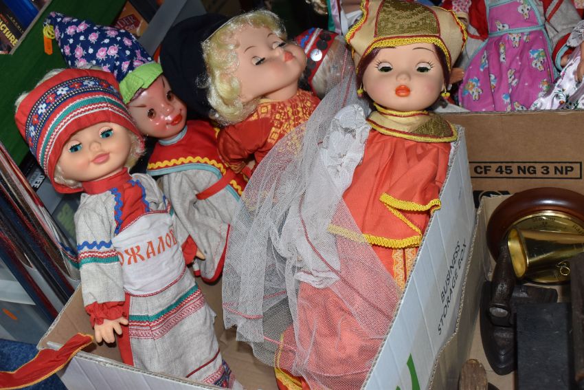 FOUR BOXES AND LOOSE MIXED MISCELLANEOUS ITEMS to include two boxes of folk dolls in various eastern European costumes, approximately ten examples, three cast iron flatirons, a boxed miniature telescope, two wood cut nursery dioramas, three leather satchels, an expanding briefcase, three camcorders to include a Sharp Viewcam 8, a Samsung MiniDV, and a Samsung MiniDV Digitalcam, etc (4 boxes and loose) (s.d)