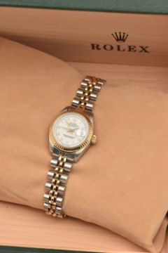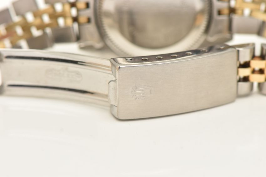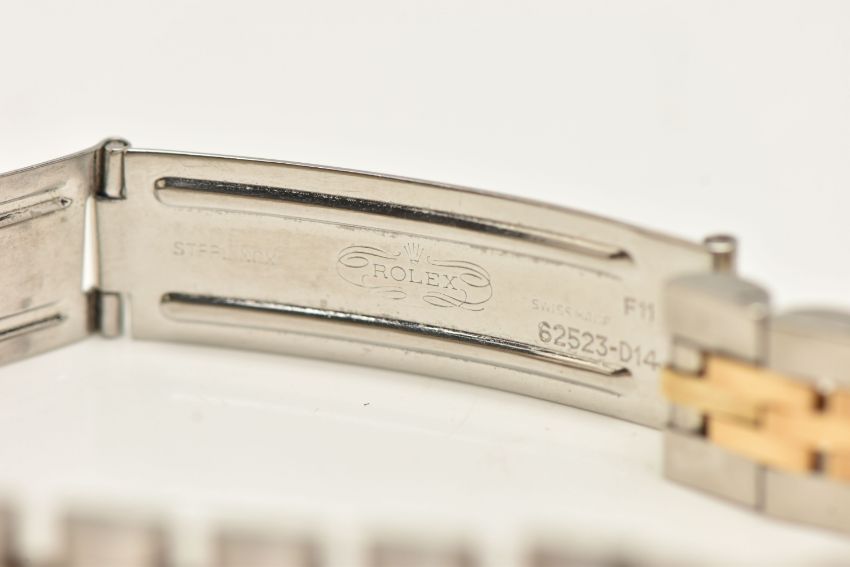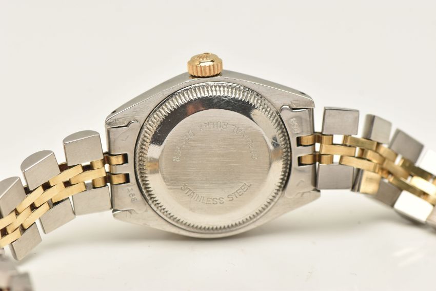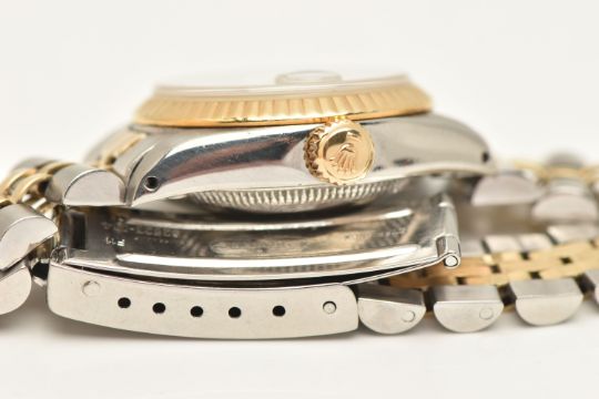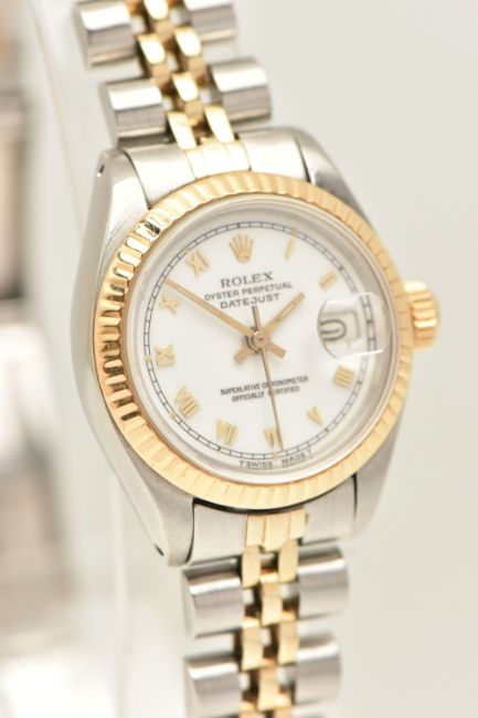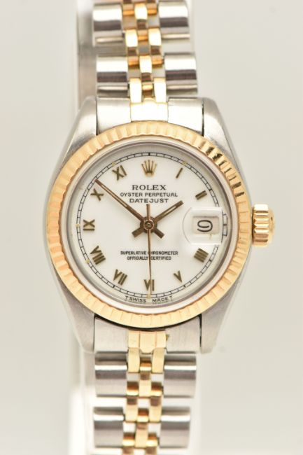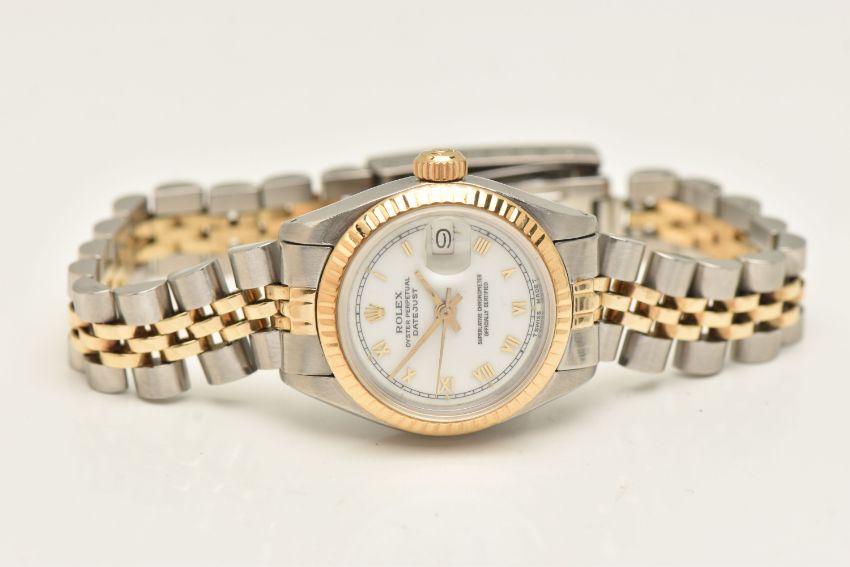 A BOXED LADIES 'ROLEX OYSTER PERPETUAL DATEJUST' WRISTWATCH, manual wind, round white dial signed 'Rolex Oyster Perpetual Datejust Superlative Chronometer Officially Certified', Roman numerals, date aperture at the three o'clock position with cyclops lense, fluted yellow metal bezel, screw down case back signed 'Original Rolex Design Stainless Steel', lugs stamped 468, approximate case width 25.4mm, fitted with a bi-colour Jubilee bracelet and folding clasp, numbered 62523-D14, F11, signed 'Rolex', approximate gross weight 54.8 grams, together with a box signed to the base 'Montress Rolex S.A-Geneve Suisse 68.00.2' (condition report: watch currently winds, sets and runs at time of cataloguing although time keeping has not been tested, general wear, extensive slack in the bracelet which will require some attention, clasp in working order, the glass and dial appear in overall good condition, time keeping has not been tested, no paperwork with this item, case back and bracelet have not been removed, viewing is advised to satisfy requirements, we cannot guarantee the working order of any watch)
