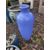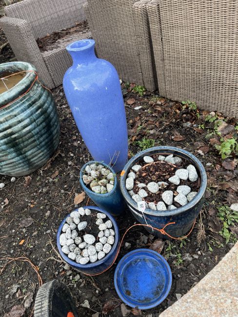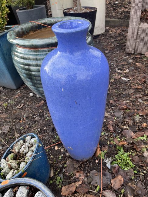 FIVE BLUE GLAZED GARDEN ITEMS including three round plant pots, an urn 70cm high and a platter(5)
