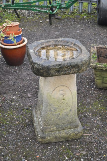 FOUR CONCRETE GARDEN ITEMS including a square sectioned bird bath 65cm high, a mushroom, two planters etc