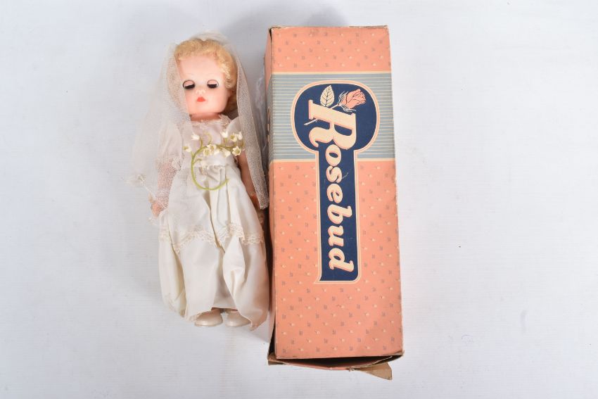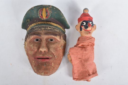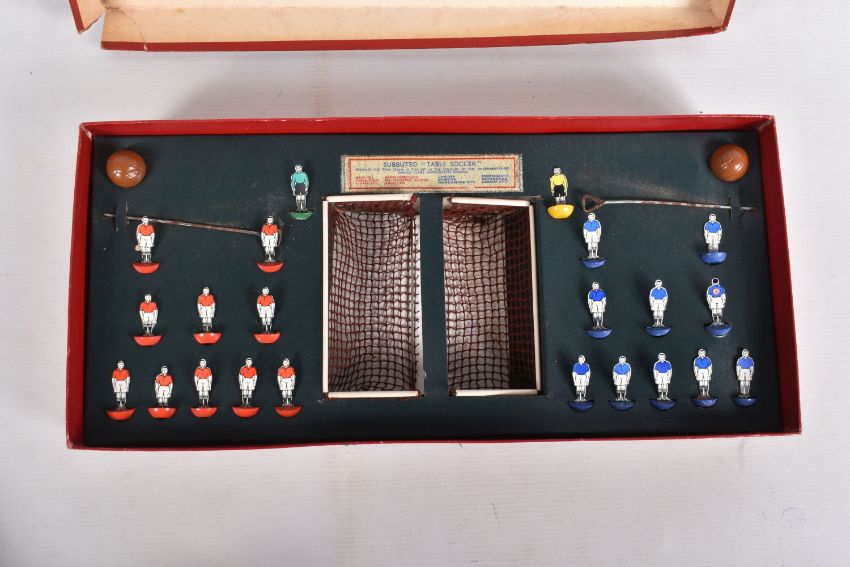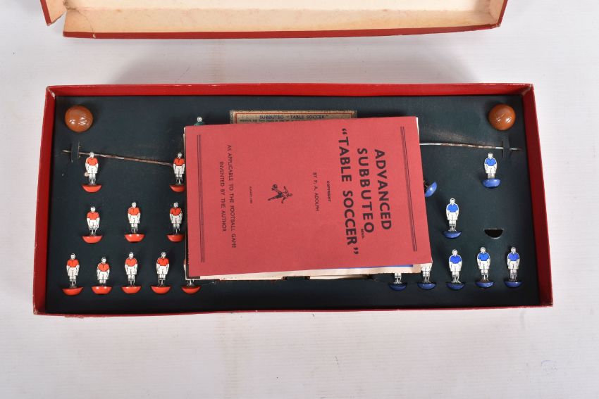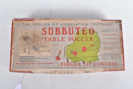 A BOXED SUBBUTEO TABLE SOCCER SET, Super Assembled set from the late 1950's, complete with both celluloid flat teams, two goalkeeper wires (some surface rusting), two balls and pitch, playworn but all in fairly good condition for their age, some players with numbers to back of shirts, assorted literature including 1956 - 57 Price List, Order Form, unused Fixture List card, instructions and other literature, box complete but has some damage and wear, with two unboxed 1970's Subbuteo heavyweight teams, No's.112 Winterthur and 115 Cape Town City, quantity of goalkeepers, all appear complete and in fairly good condition, keepers may not be original to teams, small quantity of accessories, 1950's Tiger Comic League Ladders, shows Div.1 to 4 so post 1958-59 season, appears largely complete with majority of teams and uncut Scottish teams and a 1950's Lion Comic 'Spot the Soccer Stars' quiz wheel, with a 1950's? Plaz Material (Polyester/Fibre Glass Dan Dare mask, marked Plaz Material to back, missing string and has paint loss, wear and other minor damage, boxed Rosebud Honey Hair vinyl Bridal doll, No.1600, appears complete and in good condition with only minor marking and wear, box damaged and a vintage Mr. Punch hand/glove puppet, complete but has some minor wear and damage (2 boxes)